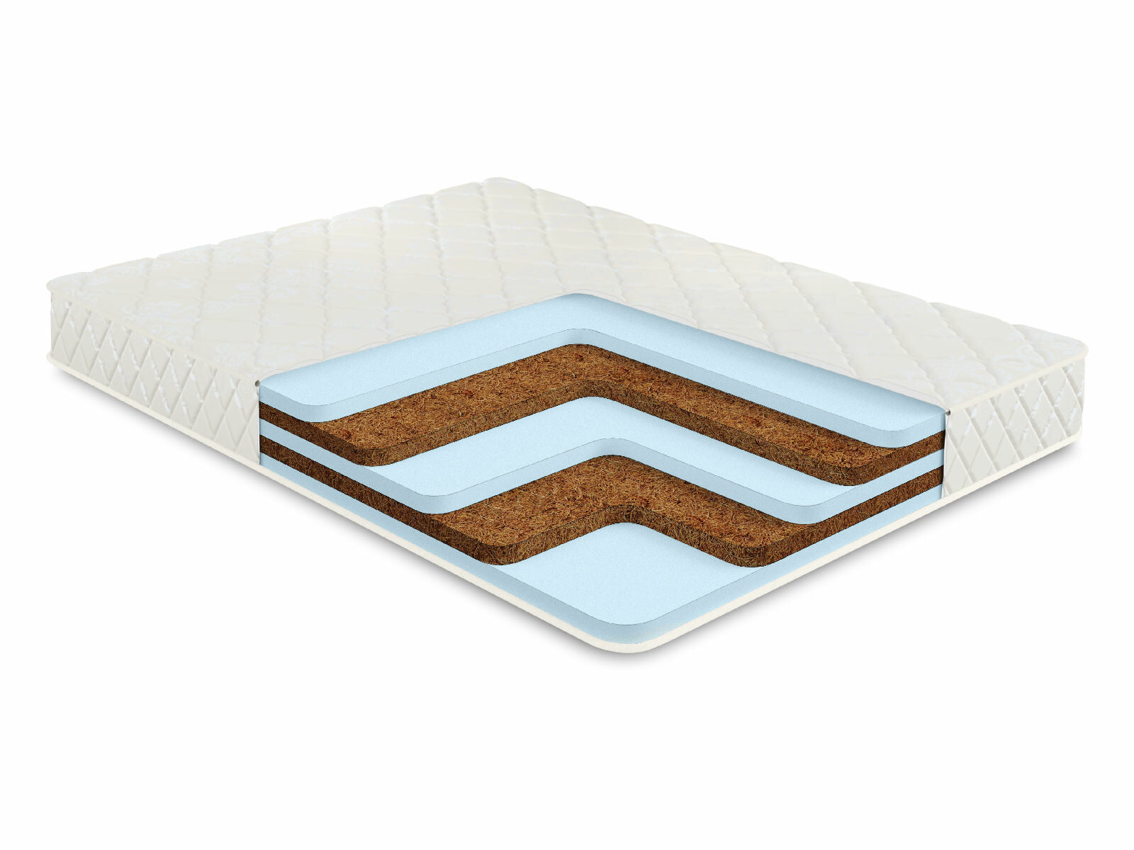 Внутри матраса установлены природный наполнитель латексированная койра кокоса, а также гипоаллергенная пена Ecofoam. Если койра добавляет модели необходимую жёсткость и правильный воздухообмен, то пена отвечает за приятную адаптивность поверхностей и комфорт человека.