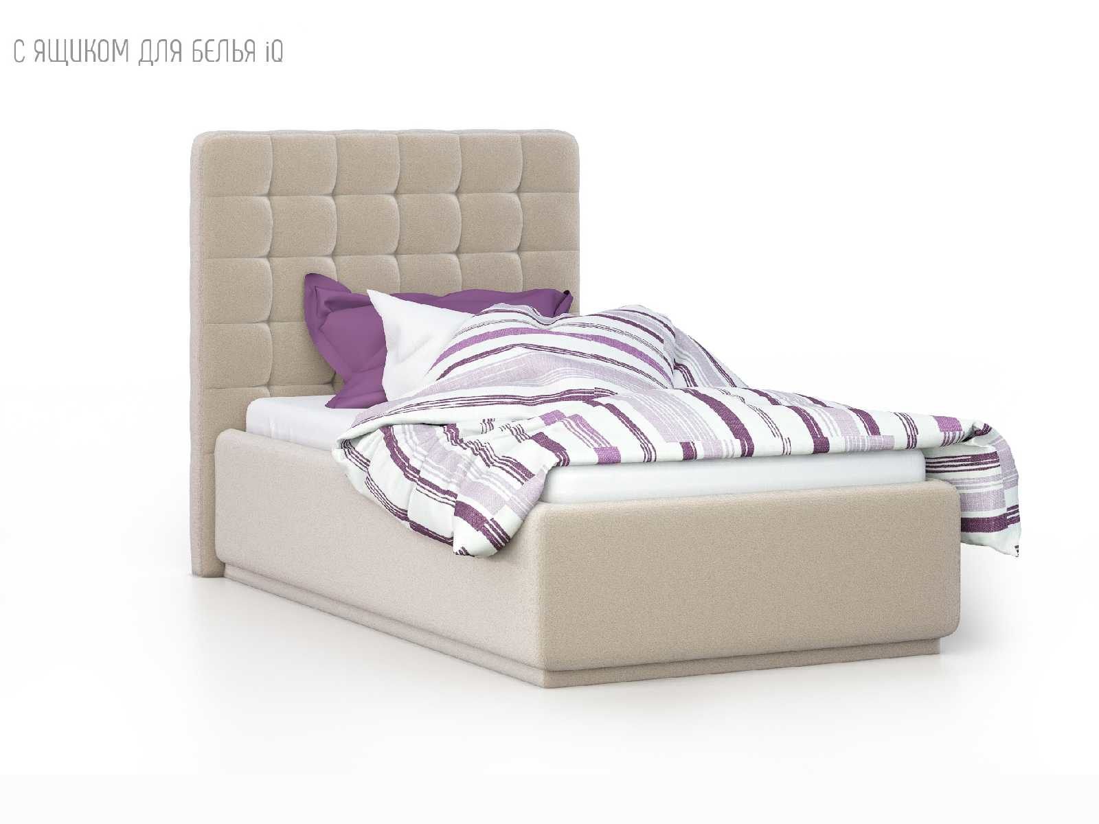 Кровать укомплектована IQ с подъемным механизмом и ящиком для белья без дна (дополнительная платная опция - дно к ящику IQ из HDF (ХДФ). Каркас кровати на цоколе, декоративный чехол на цоколе съёмный. Глубина ящика для белья - 30 см, без ограничения нагрузки на ящик.