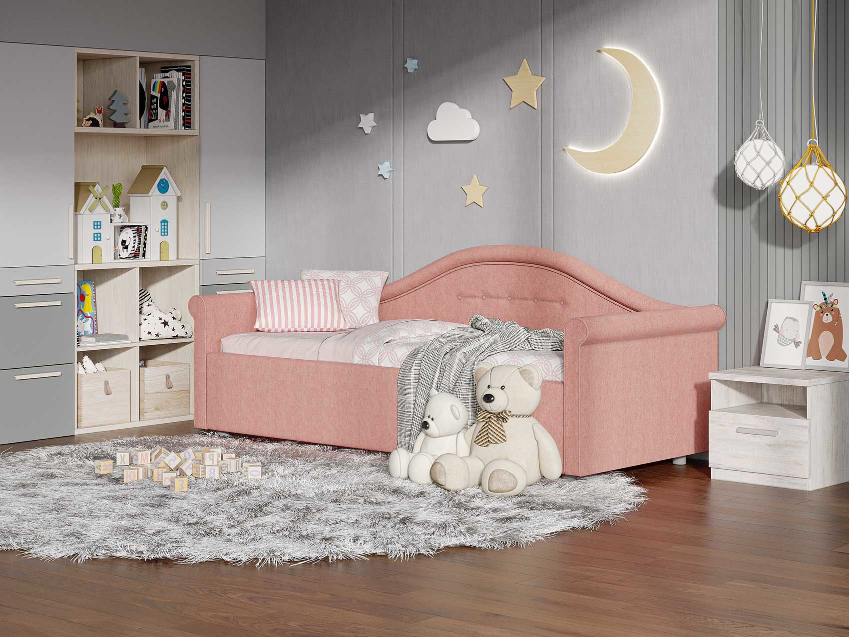 Кровать для девочки с изысканным изгибом спинки и округлыми формами подарят вашему ребенку волшебные мгновения сна. Разнообразие вариантов обивки сделает кровать неповторимой. Модель изготовлена из ДСП.