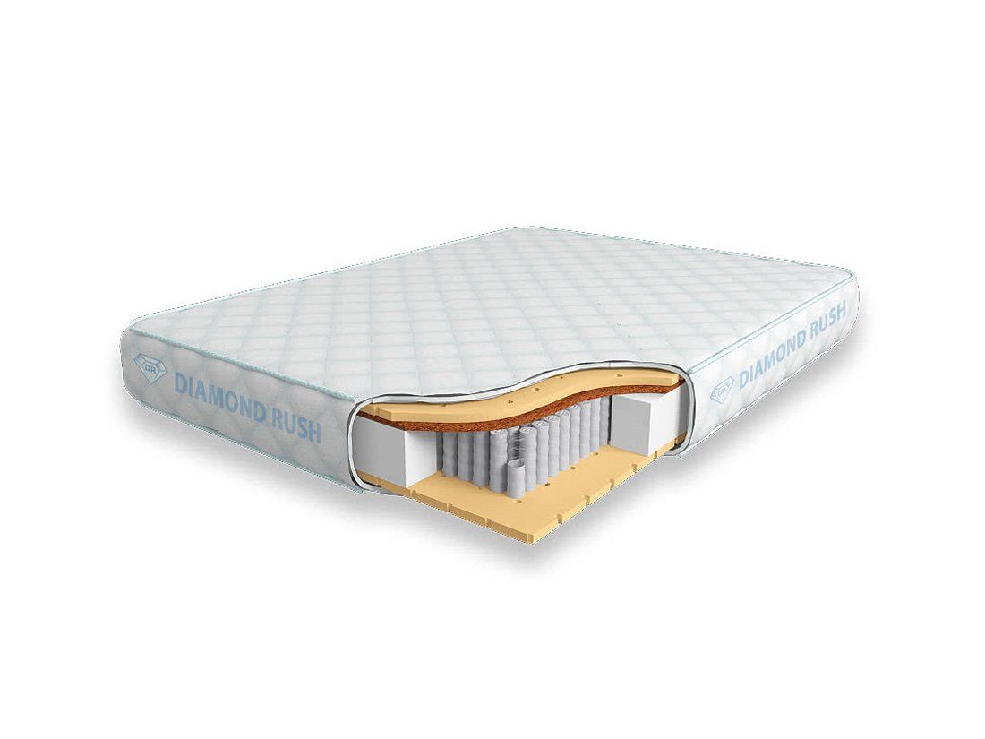 Матрас Diamond Rush Comfy-2 Contrast 1440DR имеет в своей основе независимый пружинный блок 1440, состоящий из пружин диаметром 3-4 см. В качестве настилочных слоев поверх пружинного блока используются листовой натуральный латекс с перфорацией толщиной 2см и латексированная кокосовая койра. Стороны матраса различаются по жесткости. Одна сторона мягкая, другая среднежесткая.
