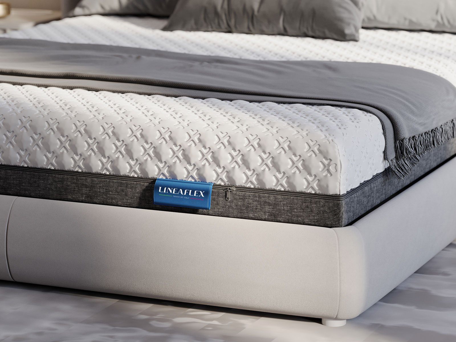 Обивка серии SkyTouch Black&White шьётся с возможностью снятия и оснащена отдельной молнией. Премиальный трикотаж чехла состоит из двух половин. Первая сторона - это плотный трикотаж без стежки, вторая сторона - это премиальный трикотаж с массажными подушечками. Изделие рассчитано на постоянные нагрузки, поэтому ткань подобрана эластичная и долговечная, с приятным к телу мягким финишем.
