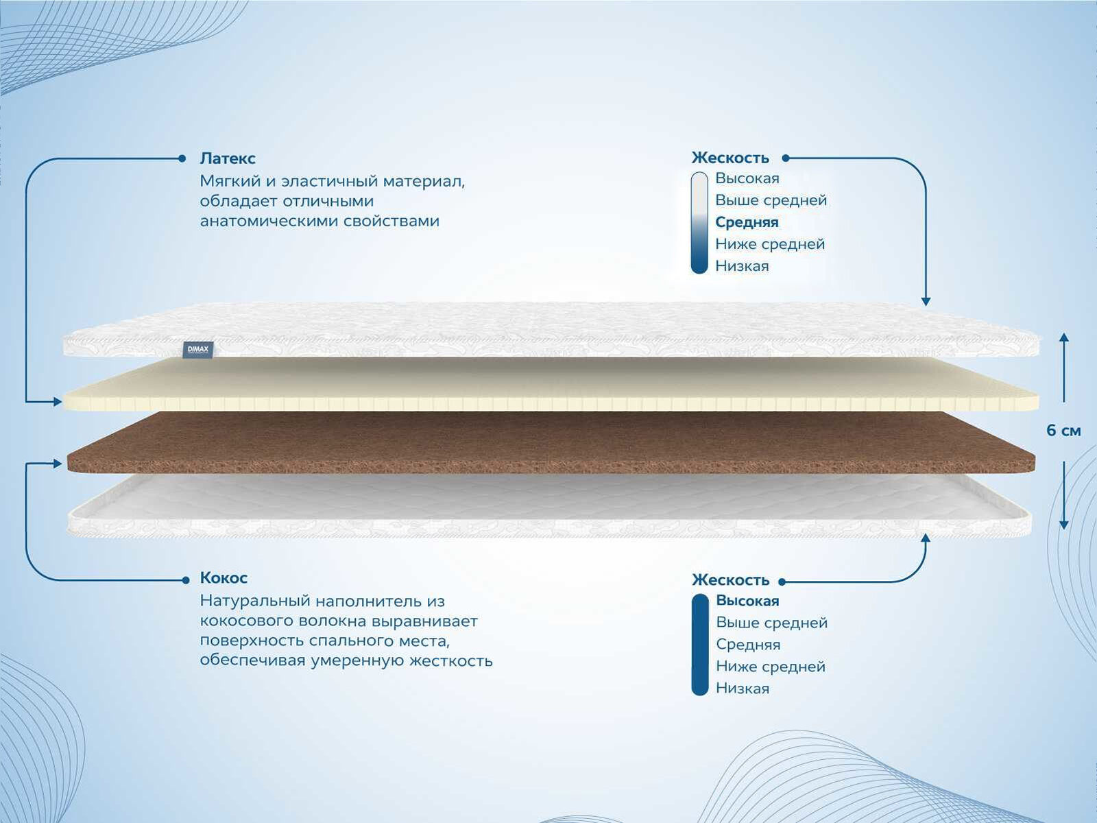 Димакс Латекс 3 см + Кокос 3 см — двухсторонний ортопедический наматрасник с натуральными материалами для оптимального баланса комфорта и поддержки. Переворачивайте топпер, чтобы выбрать между мягкостью латекса и жёсткостью кокосовой койры.