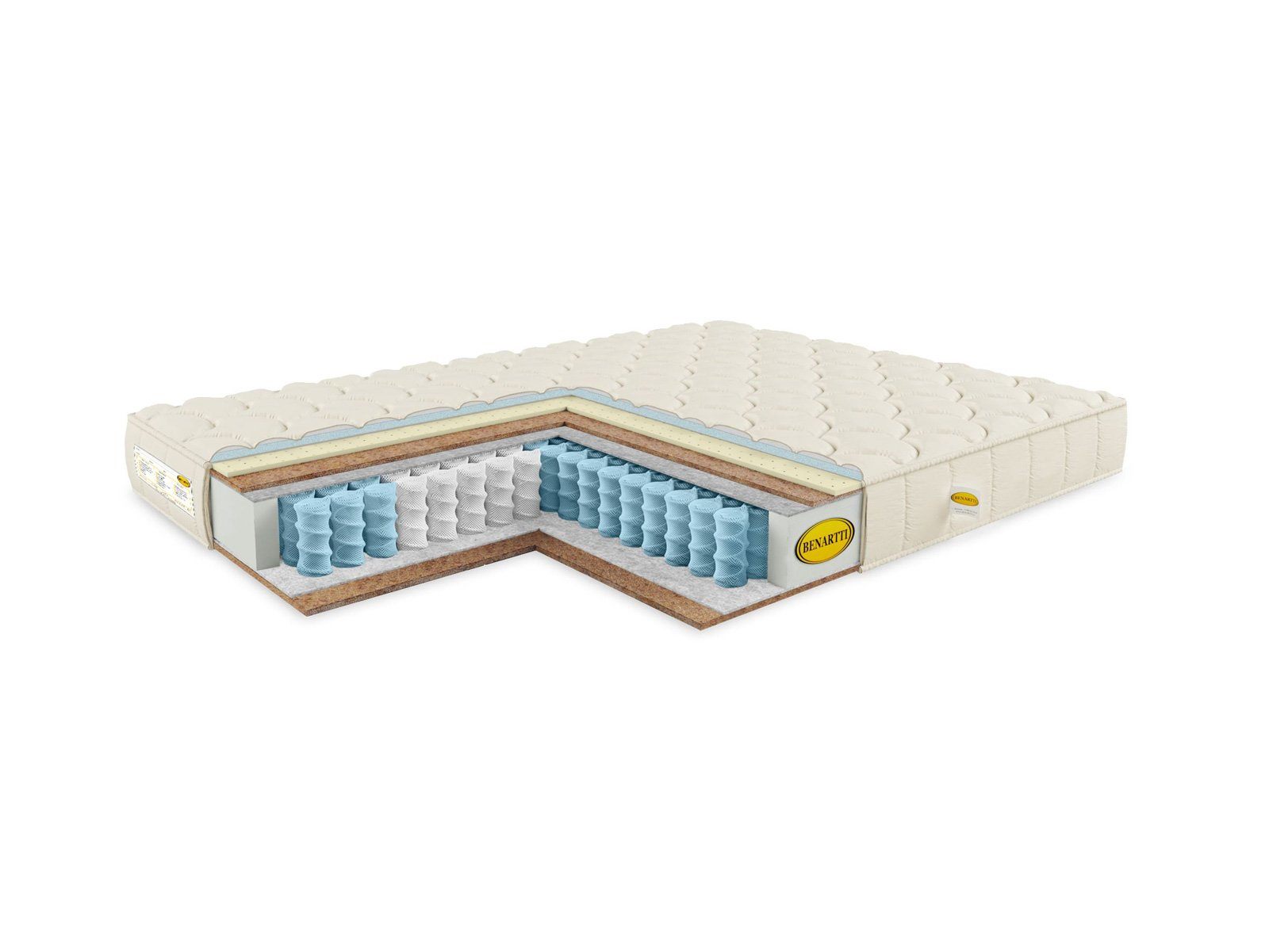 С обоих сторон от пружин стоят слои наполнителей. Они регулируют жёсткость спальных поверхностей, их комфортность и адаптивность. Верхняя поверхность представлена латексом в тандеме с кокосом, поэтому она более мягкая и уютная. Нижняя поверхность жёстче, благодаря тому, что здесь установлена одна лишь койра. Плита обеспечивает сторону хорошей ортопедической поддержкой.